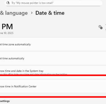 Settings > Time & language > Date & time, then enable “Show time in the Notification Center.”